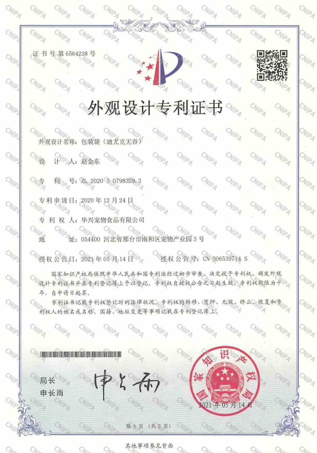 喜訊!迪尤克無谷系列包裝袋榮獲外觀設計專利證書